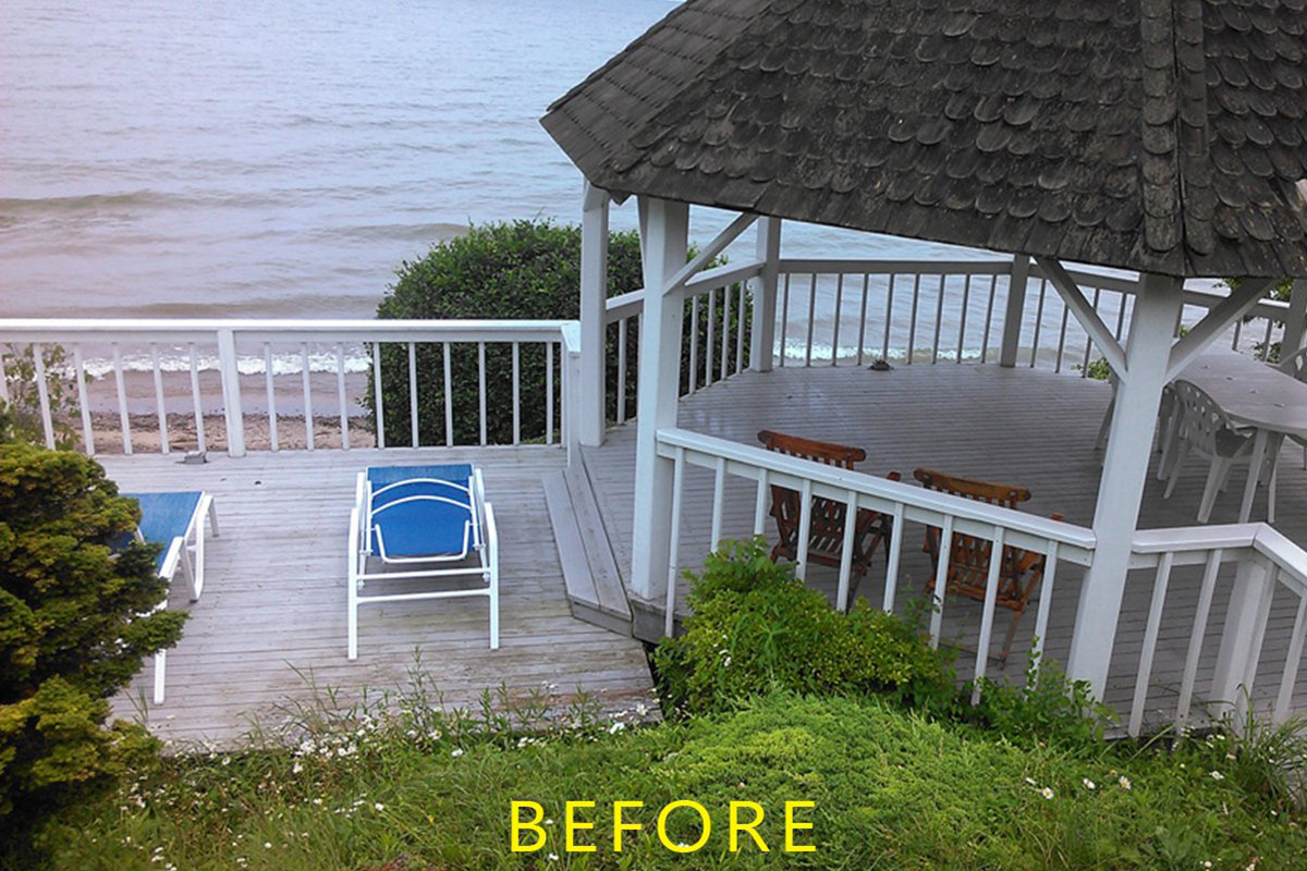 Occasionally we have the pleasure of working on waterfront property and it provides a great "office" view. Unfortunately, being that close to the shore can wreak havoc on a deck and Eric's was no exception. We decided it would be best to use a solid stain to provide a uniform look. The two-tone color scheme really helps the deck stand out, and it is now ready for a brand-new battle with the elements.