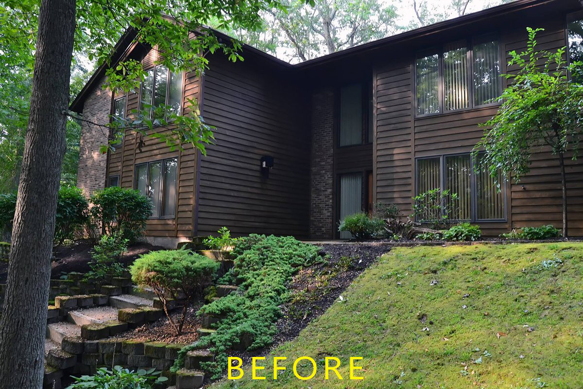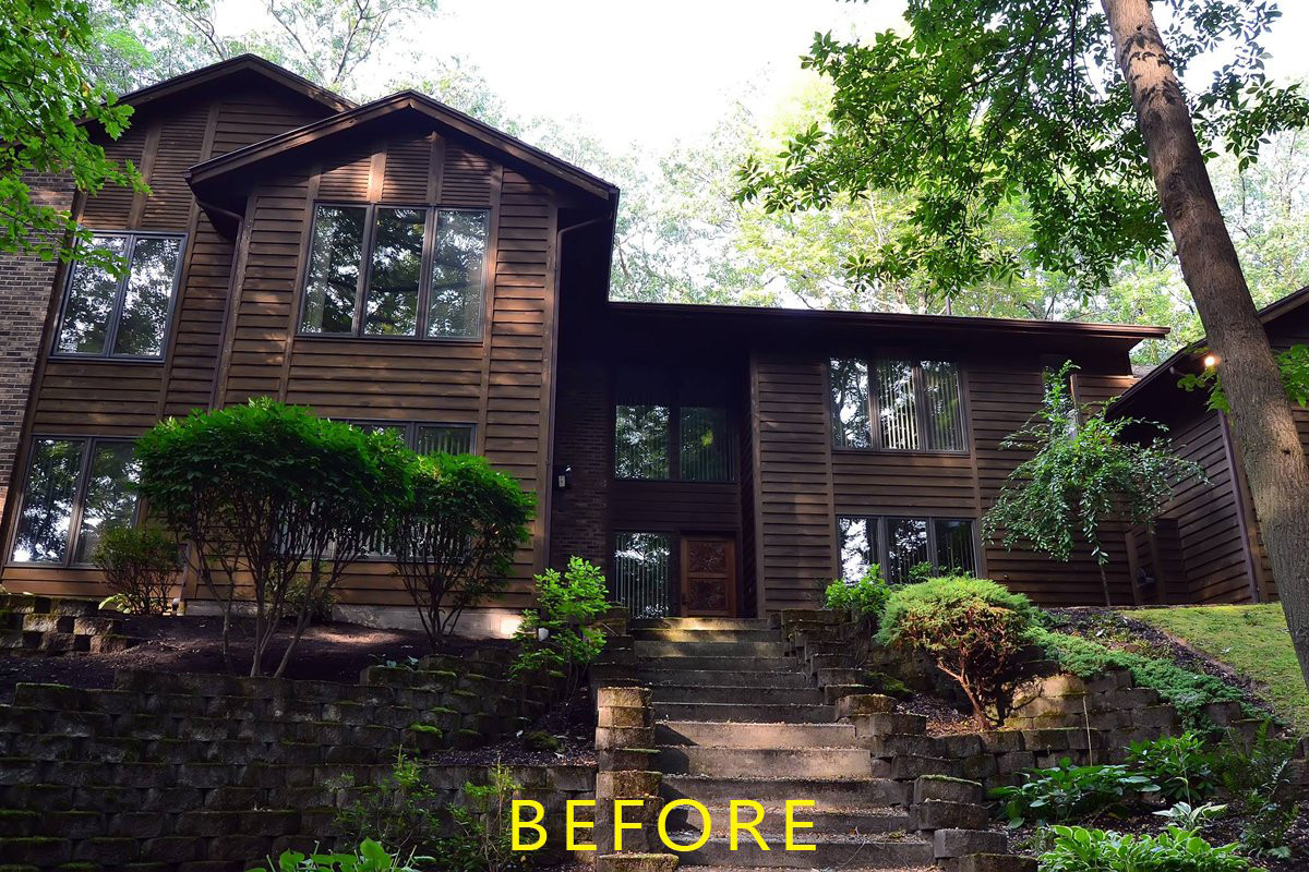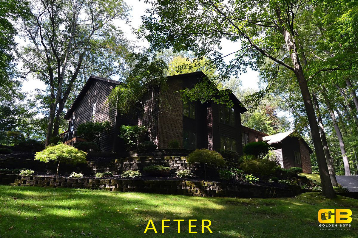 Being in the middle of the woods can provide a very tranquil living environment and Ellen wanted the home to reflect that. The dark brown stain provided the perfect mix of elegance and richness while also blending into the environment around it. The house was built into a hill which provided some unique ladder moves but our team is always ready for any challenge that comes with painting in Rochester.